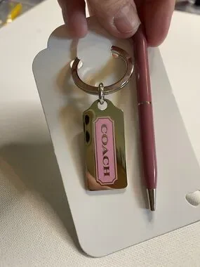Branded Coach key ring with pink enamel tag. Silver-tone metal hardware for secure attachment. Sleek, polished finish adds a refined accent. Paired with a Coach pen. NWOT