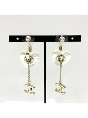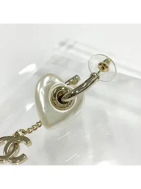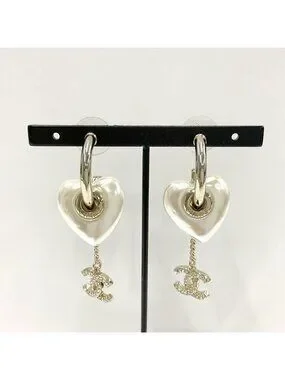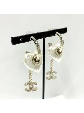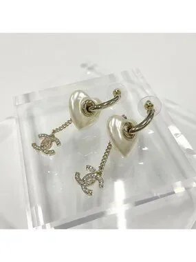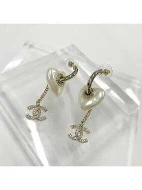 This is an authentic pair of Chanel earrings featuring a heart-shaped pearl design accented with sparkling crystal-embellished "CC" logo charms. The elegant gold-toned hoops showcase the brand's iconic interlocking double "C" motif for a timeless and glamorous look.