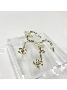 Chanel Earrings Hoop CC Logo Pearl Line Stone Gold