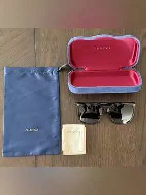 Designer Gucci sunglasses. Black glossy frame with gold branded accents. Includes branded pouch and box with gold logo. Stylish luxury accessory.