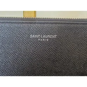 Features Saint Laurent Paris logo on front and engraved zipper pull. Interior includes card slots and black fabric lining.