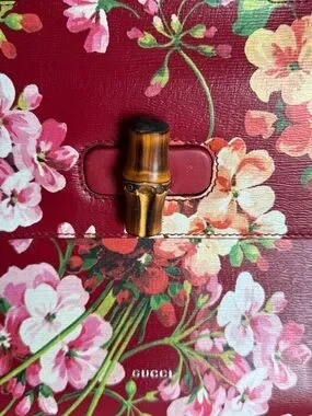 Gucci satchel in a bold red floral print. Features a bamboo-accent clasp and single top handle. Structured silhouette with vivid blossom detailing. Chic and eye-catching for refined looks.