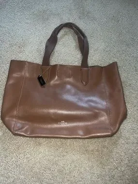 Spacious pebbled leather tote from Coach. Cognac brown tone with durable top handles. Small gold Coach logo and signature tag. Sleek, everyday carry design.