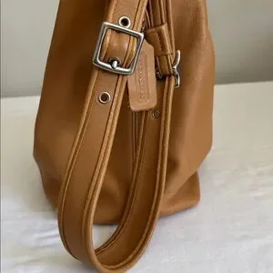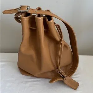 Coach Legacy Drawstring Bucket Bag in beige/tan, creed #9165. Durable leather craftsmanship, double buckle adjustable strap, original hang tag. Overall good condition, the leather is very soft and flexible, some wear and minor scuffs consistent with age and normal use, smoke/pet free. Apprx 11”x 9”x4”