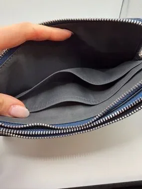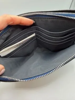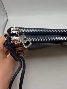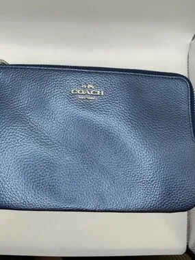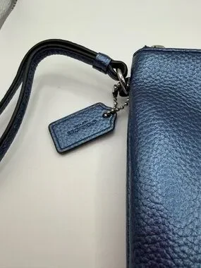 Compact Coach wristlet in pebbled metallic navy leather. Smooth zip closure with silver-tone hardware. 2 zip pockets.
