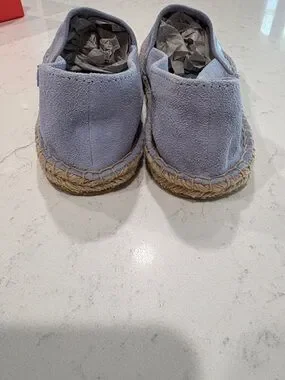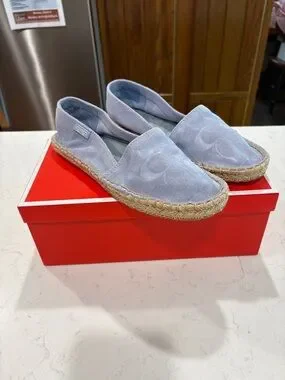 Coach espadrille slip-ons in light blue canvas. Signature tonal monogram across the upper. Jute-wrapped midsole for classic espadrille style. Easy slip-on design with cushioned footbed. Never been worn!!