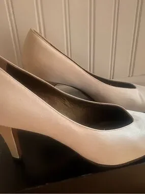 Refined 1980’s classic YSL pumps in cream satin. Sleek pointed toe and low vamp. Gold-toned interior lining adds luxe contrast. Timeless silhouette for dressy occasions.