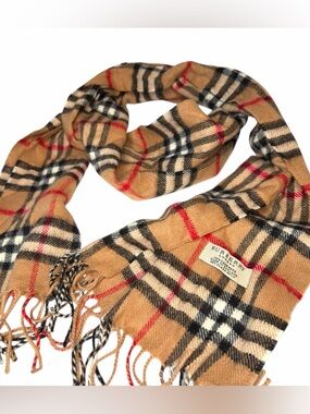 Classic and timeless, this Burberry London scarf features the iconic tan nova check pattern with black, white, and red plaid detailing. Made from 100% cashmere and crafted in England, it offers a luxuriously soft feel while keeping you warm and stylish. Finished with traditional fringe ends for a polished look.