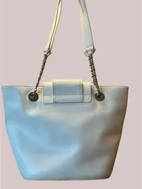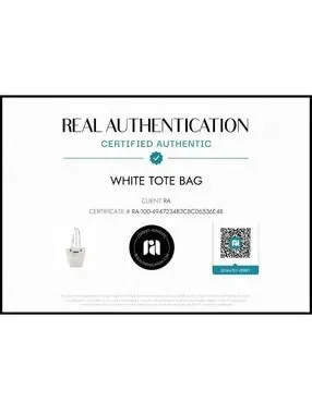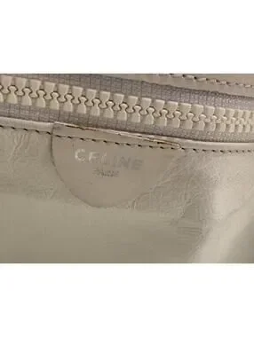 Authentic vintage Céline white leather tote, professionally authenticated by Real Authentication (QR verifiable). This elegant bag features a structured silhouette with a classic Céline metal logo plaque on the front and chain‑and‑leather shoulder straps, a signature design from Céline’s earlier era.