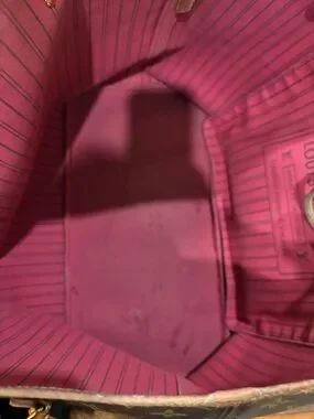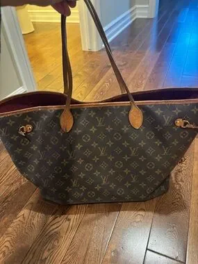 Iconic Louis Vuitton monogram neverfull tote. Brown canvas body with contrasting tan leather trim. Open top with dual shoulder straps. Spacious interior with red lining visible. Timeless designer everyday tote.