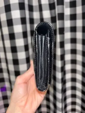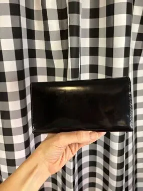 Sleek black patent leather clutch with a sparkling crystal circular accent. Elegant and compact design for evening events. Smooth finish and refined silhouette complement any outfit. Black color adds timeless sophistication.