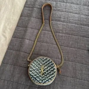 YSL Authentic Round Quilted Crossbody Denim with Gold and Leather Accents. Normal wear, no major rips or stains. Compliments every time I use! Just ready for something new.