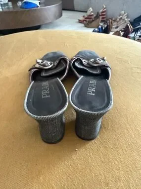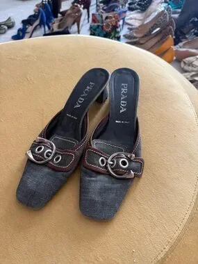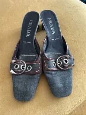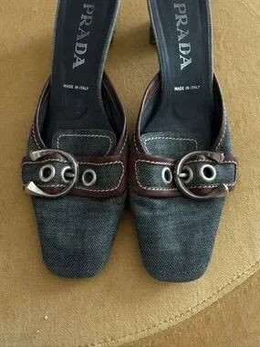 Vintage Prada Denim and Brown Leather Buckle Mules