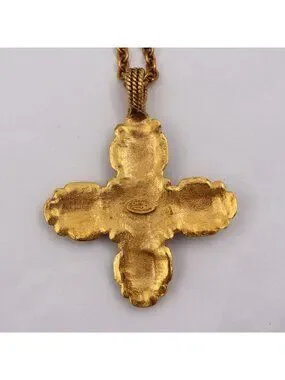 This is an authentic Chanel colored stone necklace. The necklace features a cross-shaped pendant in a gold-toned metal, adorned with red and green Gripoix glass stones in a bold, geometric design.