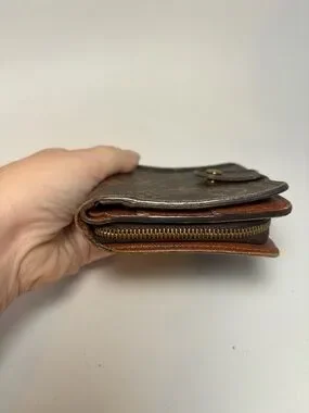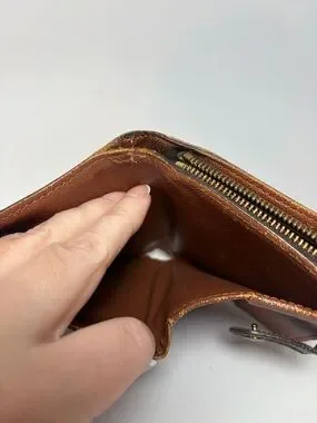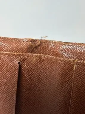 good condition! Snap is secure. Monogram canvas is bright, zipper coin pocket works smoothly. Has some edge wear and threads coming loose in interior near the top where the wallet folds (pictured). Doesn’t effect functionality at all.