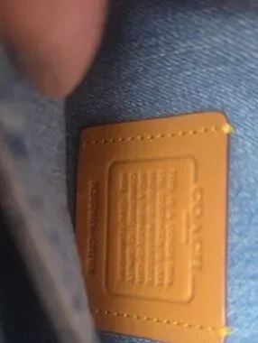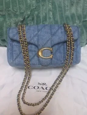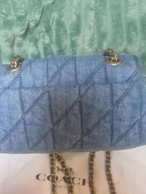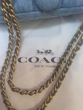 Smoke free home, Coach quilted small denim shoulder bag with prominent brass 'C' logo. Double brass chain strap for shoulder or crossbody wear. Classic quilted design in a versatile blue denim. Measures approximately 10 1/4 x 3 1/4 x 5. Hang tag was removed, due to engraving of my initials. See picture for authenticity of tag. I am willing to add from another Coach bag. It's a little darker. See picture, THIS IS AN AUTHENTIC COACH! Price FIRM! Its ALMOST NEW, no flaws, no scratches or scuffs.