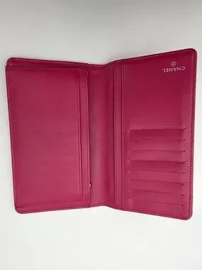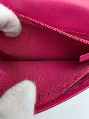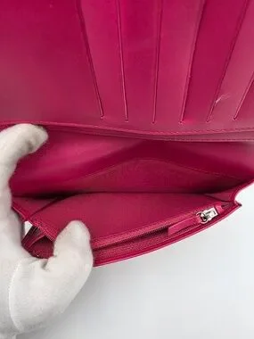 This Chanel Brilliant Long Wallet is crafted from rose pink diamond-quilted patent calfskin, offering a high-shine finish that highlights the house’s signature matelassé pattern. The polished silver-tone interlocking CC logo and matching zipper hardware provide a cool contrast to the vibrant tone. The wallet opens to a matte leather interior arranged with card slots, patch pockets, and a central zip compartment for organized storage. Combining modern sheen with classic Chanel codes, the piece balances visual impact with everyday functionality.