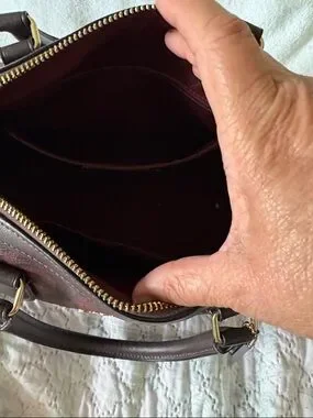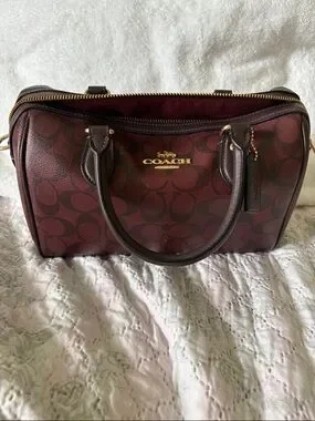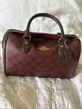 COACH satchel featuring signature logo print in rich burgundy. Dual top handles for easy carry. Polished gold hardware accents the front logo and zipper. Structured silhouette with zip-top closure. Classic design for everyday use. It has been used for about 4 times. Lovely collection.