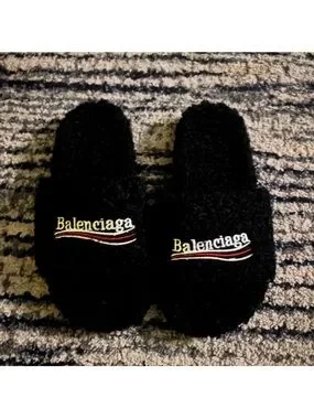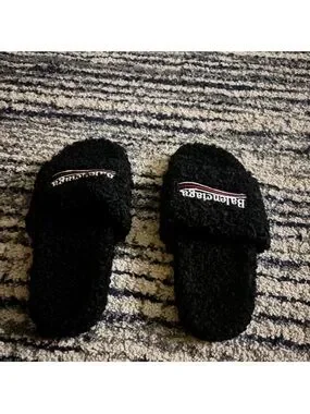 Balenciaga Black Fuzzy Logo Slide Sandals