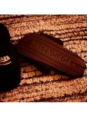 Plush open-toe slides with embroidered Balenciaga logo across the strap. Soft textured upper for a cozy feel. Easy slip-on design for casual wear. Subtle branded detail with contrasting thread.