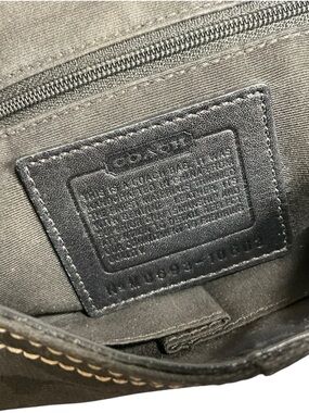 Coach shoulder bag in black signature jacquard canvas. Front buckle strap and silver-tone hardware. Leather trim with contrast stitching. Single adjustable shoulder strap for easy wear.