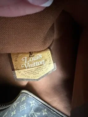 Authentic Louis Vuitton monogram canvas pouch. Rich brown canvas with tan vachetta leather accents. Zip closure and interior label visible. Stylish travel accessory. Vintage.