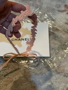 CHANEL headband in a soft blush ribbon. Scripted ribbon detail spells out stylized letters. Slim ties secure the piece. Feminine and refined accessory for styling.