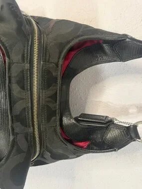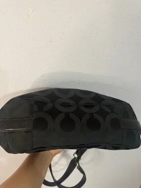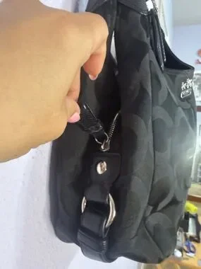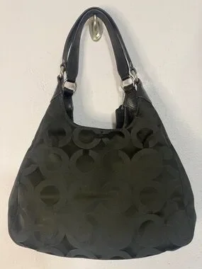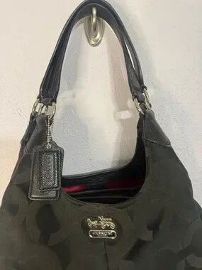 Coach shoulder bag in black signature jacquard. Polished silver hardware and logo plaque. Leather top handles for comfortable carry. Soft, slouchy silhouette holds daily essentials. Timeless design pairs with many looks.