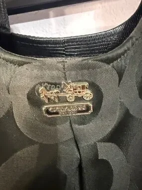 - Branding: Adorned with the classic Coach horse and carriage logo in silver or gold-tone metal on the front.