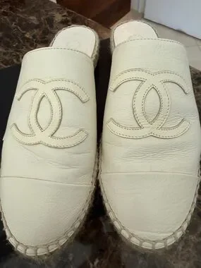 Cream leather mule slides with signature interlocking CC stitched on the vamp. Espadrille-style jute-wrapped sole. Easy slip-on design for effortless chic.