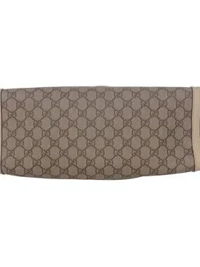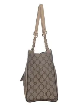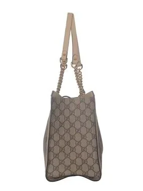 Gucci shoulder tote in beige GG Supreme canvas with cream leather trim. Gold-tone chain handles and front clasp lock. Structured silhouette with detachable leather tag. Classic monogram pattern across the body.