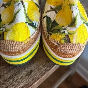 Dolce & Gabbana slip-on espadrilles with bright lemon print. Thick striped platform sole for added height. Jute-wrapped midsole with woven toe detail. Vibrant summer statement shoe.