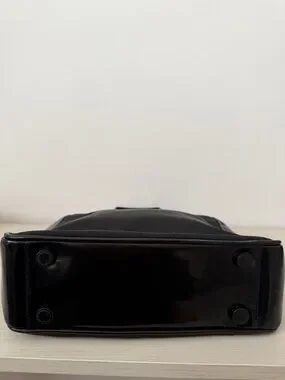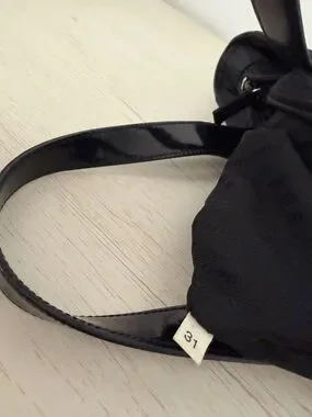 Prada black small tote bag with sleek nylon body and glossy patent handles. Elegant triangular logo adds luxury detailing. Spacious and versatile for everyday use. Classic black design pairs easily with any outfit.