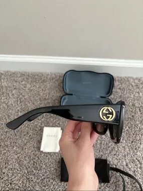 Elevating the iconic square frame to new heights, Gucci presents a solid black model in shiny black color. Crafted from premium acetate material, this unisex model boasts a sleek and sophisticated look that will effortlessly complement any outfit. The solid black lenses provide optimal protection against harmful UV rays while adding an extra touch of style to your everyday attire.
