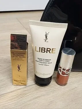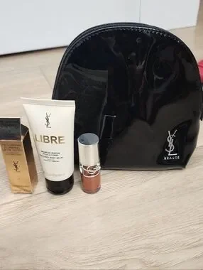 New Ysl Black Patent Leather Makeup Pouch Bag + 2 Pcs Makeup Skincare Gift Set