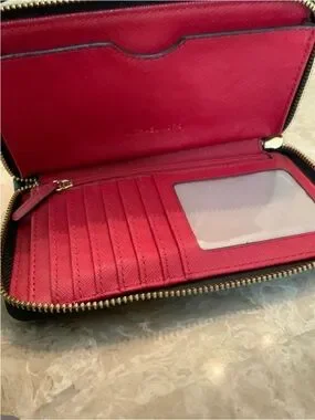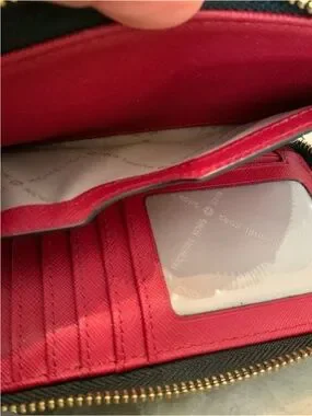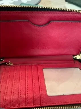 Michael Kors zip-around wallet in black with red floral accents. Gold-tone logo detail on front. Secure zipper closure and organized interior. Stylish and easy to pair with outfits