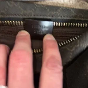 Gucci Signature GG Shoulder Hobo Bag. Incredibly dark brown, almost black, with lighter brown logo throughout. Brown leather trim and handles. Very good preowned condition with normal wear (see photos). Zip closure. Approximately 7"x10"x4" with 9" strap drop. Measurements are approximate as bag is not a structured shape.
