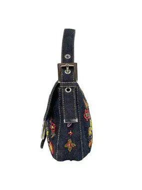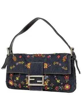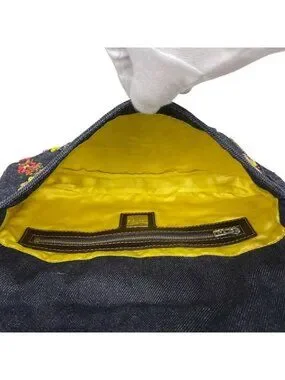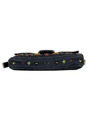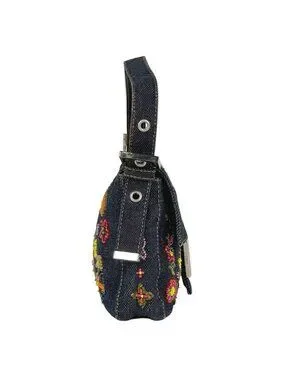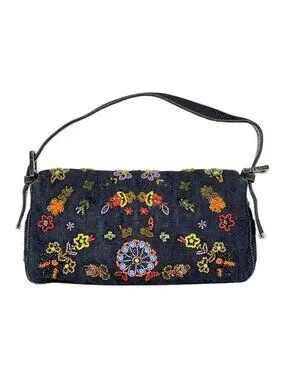 Fendi Zucca Pattern Mamma Baguette Beads Embroidery Shoulder Bag Denim Navy