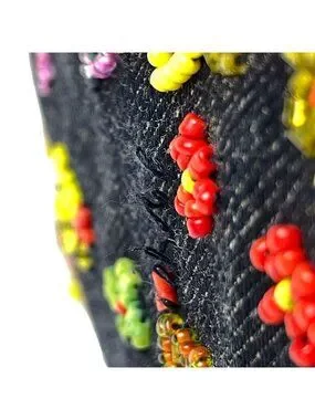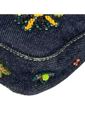This is an authentic Fendi Zucca Pattern Mamma Baguette Beads Embroidery Shoulder Bag in navy denim. The bag features Fendi's iconic Zucca pattern accented with colorful beaded embroidery, a buckle closure, and a detachable shoulder strap.