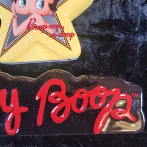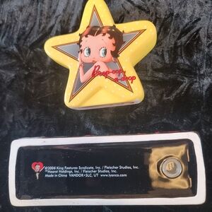 Betty Boop ~ Boop oop-a-doop ~ Ceramic Star ~ Stacking Salt Pepper w/Bimbo & Pudgy, her pals. Few people know, but Betty Boop made workplace harassment a watercooler topic in the 1930s. Licensed by King Features, adorable design, Classic Betty Boop on the front of the star, and her 2 sidekicks, Pudgy & Bimbo on the back. The yellow star sits in a black base, and reads Betty Boop on the front.