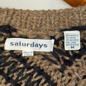 This Vintage 1980's Sweater from saturdays was Made in Korea and constructed in 15% Wool, 85% Acylic black & brown twisted chunky knit. it features a round crew neckline, ribbed knit collar/cuffs/waistband, long ballon sleeves and a relaxed silhouette. This is vintage, 80s, stranger things, classic, boho, artsy, cozy, coastal, autumnal, winter, chunky, boxy, relaxed, office, neutral vibes.