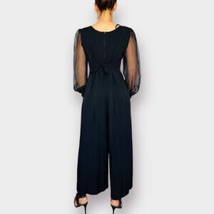90s one-piece with sheer full sleeves and wide flowy leg pants. Scoop neck with decorative button details. Back cinch tie.