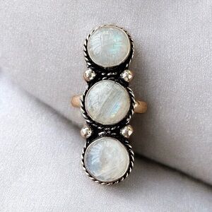 This elegant ring features three stunning white stones set in a silver band. Perfect for adding a touch of sophistication to any outfit. Rainbow moonstone holds feminine energy and the energy of the stars. Walk with your head held high and exude femininity while people turn their heads to look at your statement ring as it catches the light, weather sunlight, candlelight or any light. It lights off with the fire of the universe..