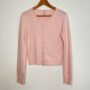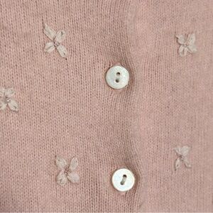 Gorgeous girly sweater with tiny silk bows, mother of pearl buttons, and teeny iridescent beads at the center of the bows. Precious!