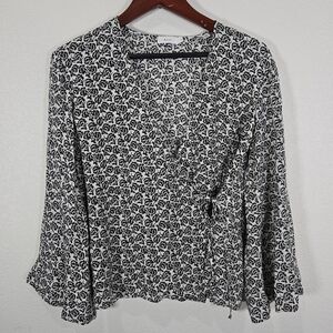 A.L.C. Size 6 Ray Deep V Bell Sleeve Printed Silk Wrap Top Eggshell/Black