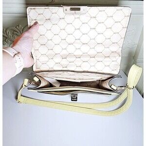 Elevate your style with this stunning Aldo crossbody purse in a gorgeous yellow hue. The medium-sized bag boasts a faux leather exterior with a buckle accent and gold chain trim, making it the perfect accessory for any occasion. The bag measures 10 inches in width, 8 inches in height and 6 inches in depth, providing ample storage space for all your essentials. The handle/strap color is a beautiful shade of yellow that complements the exterior perfectly.