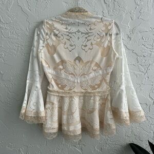 This ruffled 3/4 sleeve top features a delicate white and ivory lace overlay, a peplum waist, and intricate contrasting white lace detailing.
