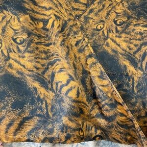 Cat eyes peer out from the tabby-swirl print on this silky wrap-front blouse that will rack up the likes with every posting—er—wearing.