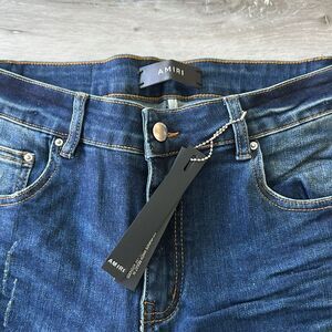 AMIRI Skinny-Fit Leather Appliquéd Distressed Jeans Blue/Black 32 NWT