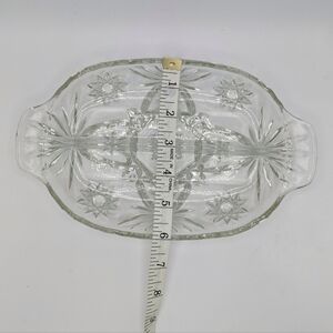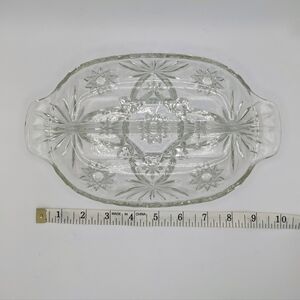 Excellent condition vintage relish dish. Beautiful pressed glass with a mid-century modern design esthetic.